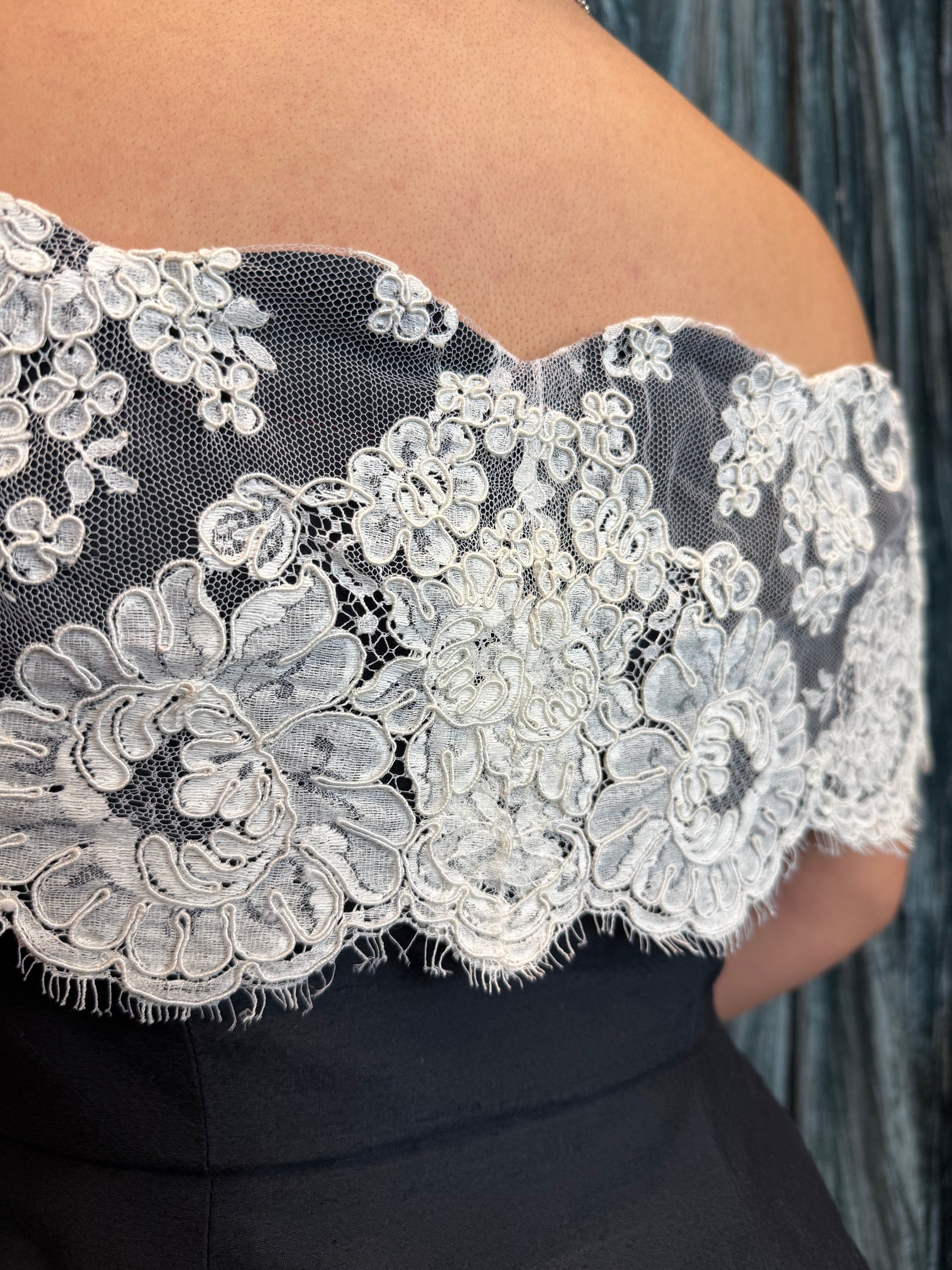 One-of-a-kind 80's reworked off the shoulder, strapless, lace peplum style top with statement pearl buttons. Perfect to pair with a mini skirt, as shown.
