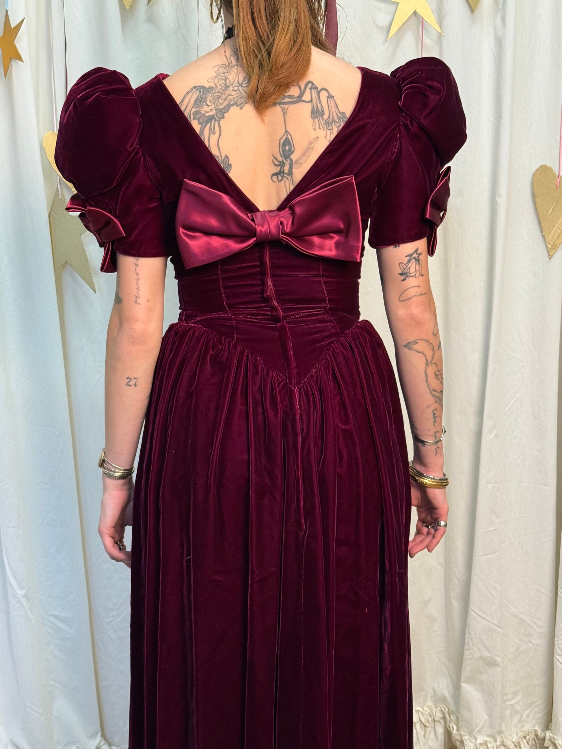 Classic deep red evening dress featuring red velvet, three large bows on back and superstore material.